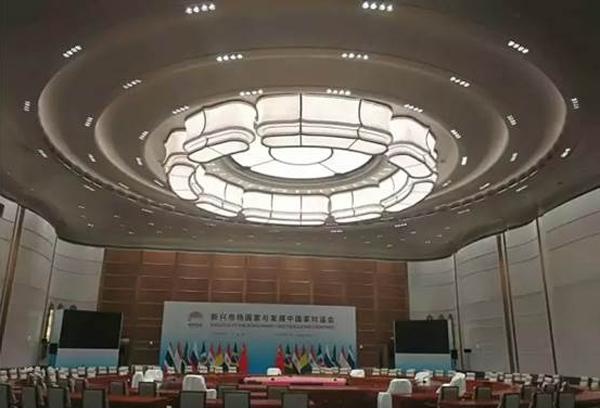鼓浪廳的吊頂和銅墻面和鳳凰廳竹葉主題的設計不同,鼓浪廳則采用海浪設計,暗喻各國首腦集聚于此,蓮花鼓造型的吊燈象征集結與振奮。