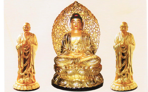 “佛陀觀”便分為法、報、應三身。遍滿宇宙寂靜之無色無形的理佛,稱為法身佛;為著救度眾生經過長時間積功累德的結果而顯現出佛身,并建立凈土的是為報身佛;因化益眾生,而出現在娑婆世界的,是為應身佛。如大日如來為法身佛,彌陀如來為報身佛,釋迦如來為應身佛。諸佛的名字在經典上記載的,有盧舍那佛、大日佛、釋迦佛、阿彌陀佛、藥師佛等,還有寶生佛、開敷華王佛、天鼓雷音佛、阿閦佛、不空成就佛、多寶佛、定光佛(嚴佛像制)等是較少聽到的。佛有時稱如來,這是梵語多陀阿迦度的意思。佛陀圣像在寺院中,供俸著許多種佛像,因為其身分不同,佛像的形象、材料、種類也不相同,佛相依其身分,可分為佛、菩薩、明王、天等數種。
