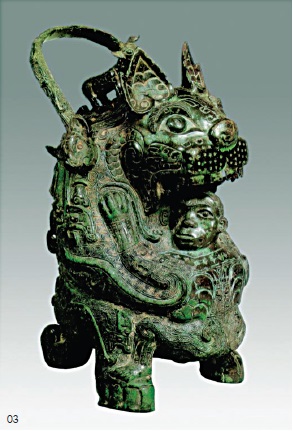 該器表面大部分呈黑色,局部留有很薄的綠銹,它和許多出土于湖南的商代后期的青銅器一樣,紋飾繁縟,以人獸為主題,表現怪異的理想。