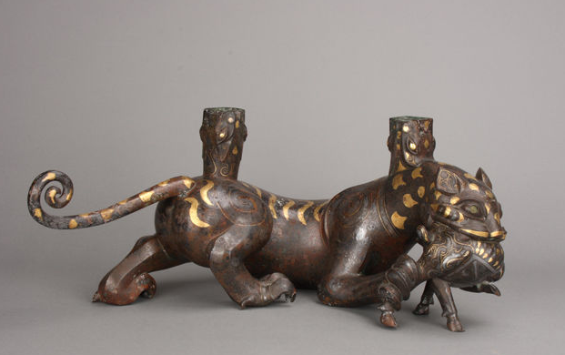 錯金銀虎噬鹿屏風座,戰國時期的家具構件。老虎的兇猛與小鹿的弱小形成鮮明對比。典型的戰國時代風格。動物腹下刻有銘文,說明制作時間及官匠姓名。